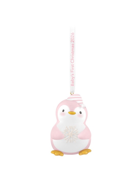 Celebrate a sweet new addition to the family with this baby's first Christmas tree ornament. The delightful decoration features an adorable pink and white penguin wearing a striped stocking cap and holding a snowflake with a year-dated, commemorative message on the hanging ribbon. Perfect for celebrating a new daughter, granddaughter or niece.