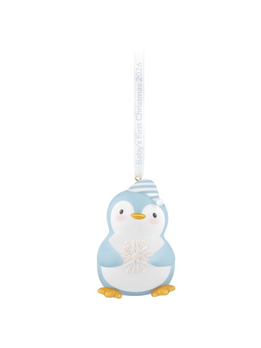 Celebrate a sweet new addition to the family with this baby's first Christmas tree ornament. The delightful decoration features an adorable blue and white penguin wearing a striped stocking cap and holding a snowflake with a year-dated, commemorative message on the hanging ribbon. Perfect for celebrating a new son, grandson or nephew.