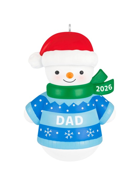 Melt hearts and celebrate family with this charming snowman Christmas tree ornament. The fun decoration in honor of dad features a smiling snowman dressed in a festive blue sweater, red hat and green, year-dated scarf. Coordinating mom, daughter and son ornaments (sold separately) will bring holiday cheer to your winter wonderland.