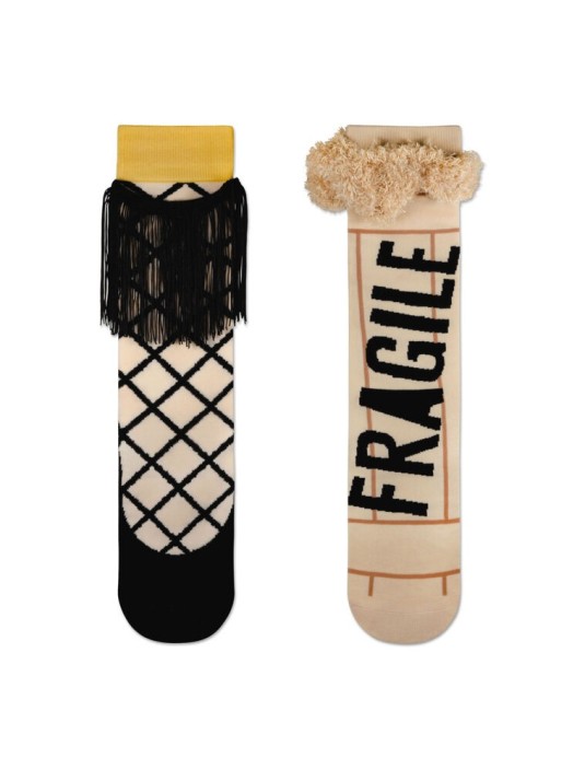 Celebrate the season with socks as unique as you are. Inspired by "A Christmas Story," these mismatched novelty socks will shine a light on your impeccable fashion sense. One sock features the iconic leg lamp, complete with stiletto toe, fishnet stocking details and a fringed lampshade cuff. The other sock resembles the stamped wooden crate it arrived in, topped with fabric "straw" accents and the word "Fragile" stamped along the front. Together, they’re a perfect tribute to Mr. Parker's Major Award. Slip them on and let your feet do the standing in for holiday fun.