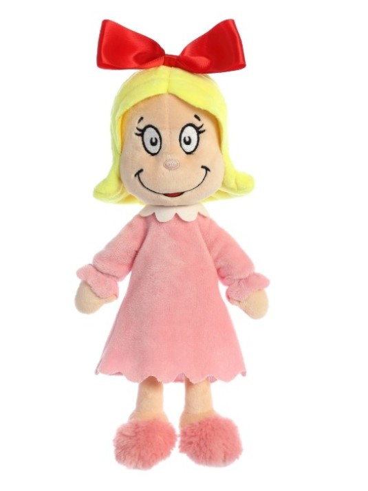 Celebrate the spirit of Christmas and the joy of Whoville with the Cindy Lou Who Dood Plushie from the Officially Licensed Dr. Seuss x Aurora collection. This plush captures the heartwarming cheer of one of Whoville's most beloved characters, Cindy Lou Who, with her bright yellow hair topped with a large red bow and dressed in a soft pink dress complemented by fluffy pink slippers.