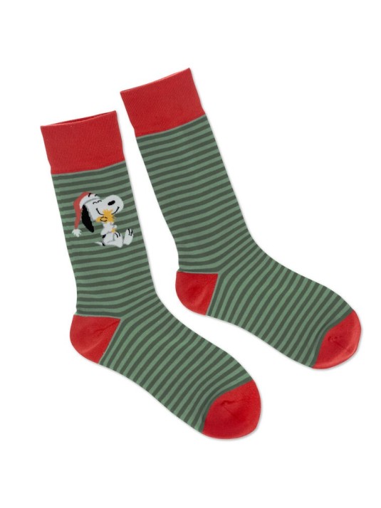• Peanuts holiday socks feature Santa Snoopy and Woodstock on green stripes, with red heel, toe and cuff accents.