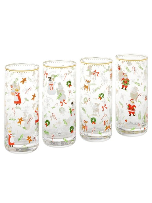 Add a little vintage Christmas charm to all your meals with this set of four drinking glasses featuring assorted holiday designs and gold foil trim. Each glass displays a different Christmas friend—Santa Claus, Mrs. Claus, a snowman and a reindeer—amid festive illustrations of candy canes, wreaths, presents and more. These fun beverage glasses hold 12 ounces each.