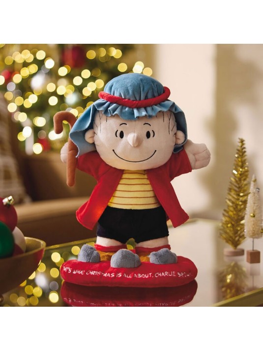 Spread tidings of great joy with this Peanuts talking plush with motion and light. Linus interactive stuffed character wears his Christmas pageant shepherd costume and holds a staff in one hand. Listen to the true meaning of Christmas when you press the base of the plush figurine and hear him say several lines from his iconic speech in the holiday special "A Charlie Brown Christmas." Peanuts fans of all ages will love to watch this plush Linus talk and move his arms as stage lights shine on him from the base.