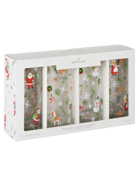 Add a little vintage Christmas charm to all your meals with this set of four drinking glasses featuring assorted holiday designs and gold foil trim. Each glass displays a different Christmas friend—Santa Claus, Mrs. Claus, a snowman and a reindeer—amid festive illustrations of candy canes, wreaths, presents and more. These fun beverage glasses hold 12 ounces each.