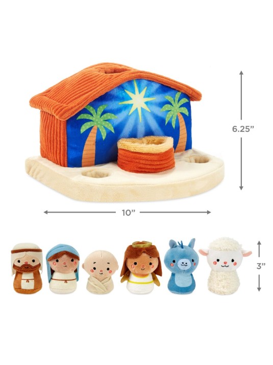 Tell the story of the first Christmas in a way little ones will love with this adorable plush Nativity play set. The soft, fabric manger scene includes three openings at the base and one opening at the top to tuck in any of the six mini plush characters: Joseph, Mary, Baby Jesus, an angel, a donkey, and a sheep. Perfect for storytelling and play, this sweet set makes a meaningful gift from grandparents, godparents, aunts, uncles, and anyone wanting to share the joy of the season.