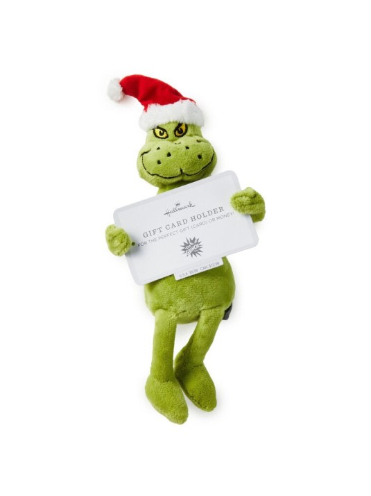 Slip a gift card or mini Christmas card into the arms of this adorable Grinch plush for a gift anyone on your list will love. This green stuffed animal Grinch from the Dr. Seuss classic book "How the Grinch Stole Christmas!" makes a fun way to present a holiday gift card. Attach Grinch in his Santa hat atop a holiday gift, hide him in a mug or a coat pocket, or tuck him into the branches of your Christmas tree for a sweet surprise.