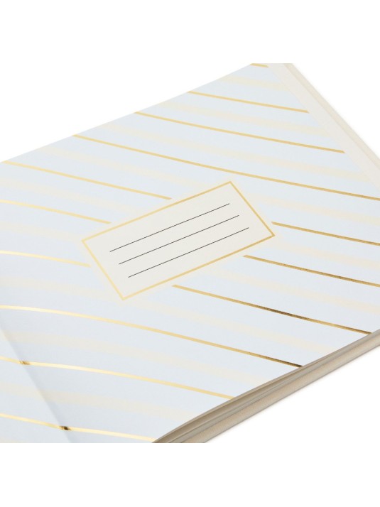 Invite all the guests celebrating your union to add their names and well-wishes to this lovely wedding guest book. The hardback guest book is covered in cream linen decorated with gold foil lettering and includes 48 lined pages for adding signatures and well wishes. Diagonal striped endliners with gold foil accents add an elegant touch.