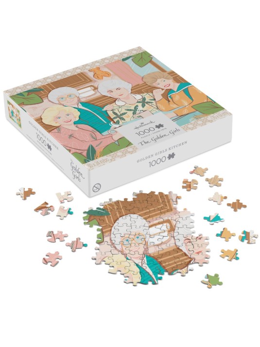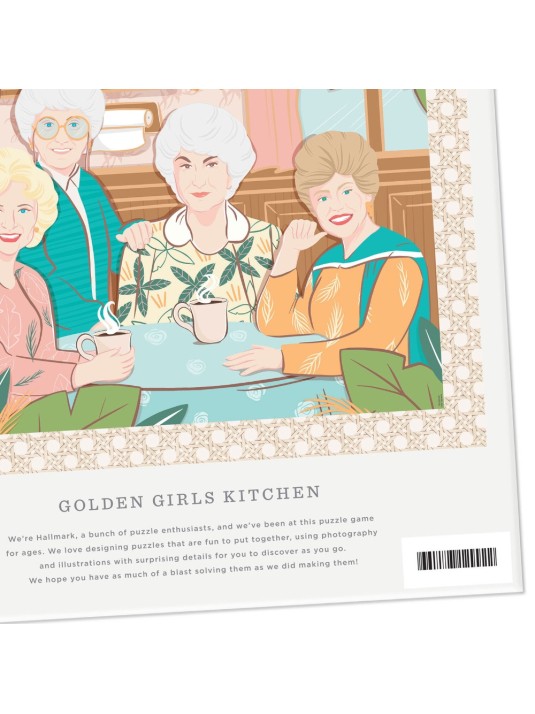 Piece together the charm, humor, and heart of Miami’s favorite foursome with this delightful Golden Girls-inspired 1000‑piece puzzle. The cozy, illustrated kitchen scene brings Dorothy, Blanche, and Rose together at their table to sip coffee and dish, while the short and sassy Sophia stands beside them. Fans will love spotting playful details — like the tropical leaves of houseplants, the famous copper lobster mold on the wall, and the woven wicker frame around the scene — as they put the jigsaw puzzle together. Warm, colorful, and full of nostalgia, this puzzle is the perfect way to celebrate the girls’ unforgettable friendship.