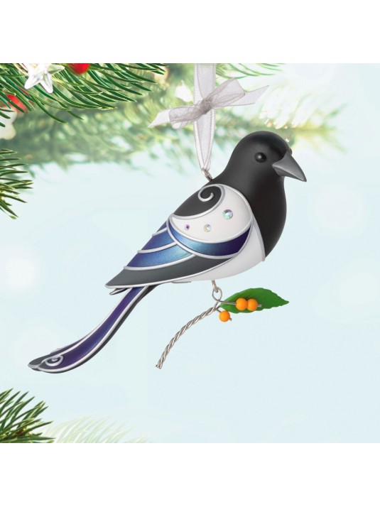 Add nature's splendor to your holiday celebrations with this pretty Black-Billed Magpie Christmas tree ornament. The charming black, blue and white feathered friend, featuring metallic silver embellishments, gem details and a dangling berry stem, is sure to delight bird enthusiasts.