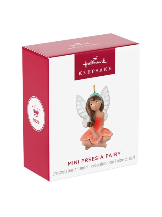 Make the holidays a little sweeter when you hang this cute miniature fairy Christmas tree ornament. The pretty brunette pixie is dressed in a petal-perfect pale orange dress with sparkling glitter accents and a soft blue headband that matches her eyes. A dusting of glitter on her wings adds shimmer to her demure pose. She makes the perfect addition to a mini tabletop tree or your Fairy Messengers Keepsake Ornament collection.