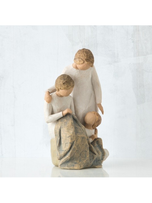 • Figure of seated older woman in cream dress, sewing blue quilt on her lap; standing woman in cream dress at her shoulder; seated young girl in cream dress at her feet