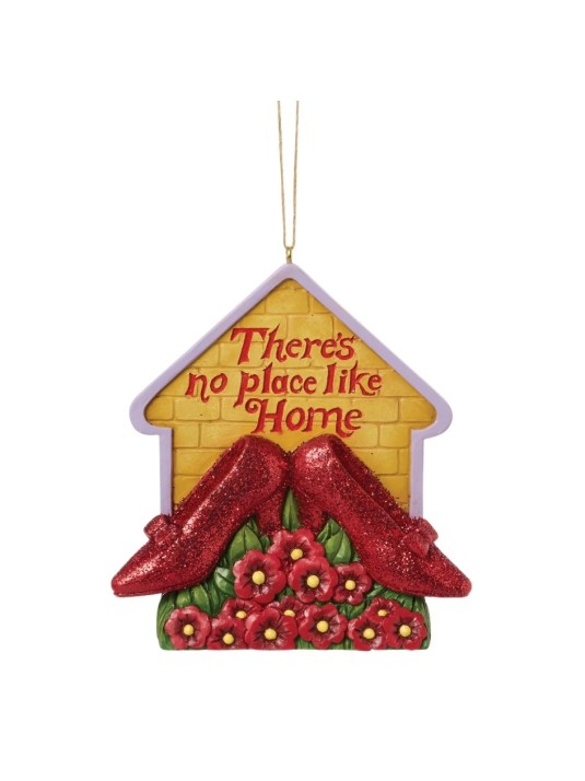 This captivating Jim Shore ornament features a Yellow Brick Road house outline adorned with Dorothy's sparkling slippers and vibrant red flowers. Inscribed with the message "there's no place like home," remember to enjoy the holidays together.