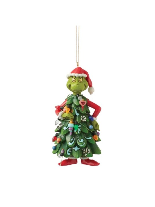 Dressed as a Christmas tree, the Grinch holds an ornament, mischievously decorating himself in this playful Jim Shore design. Disguising his scheme, he's ready to steal Christmas in plain sight, right from the branches of your Christmas tree!