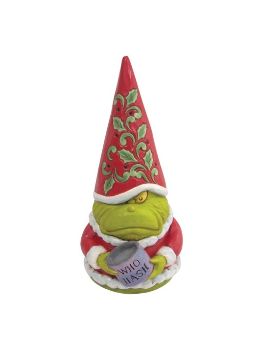 This green faced Jim Shore gnome takes after the beloved Dr. Seuss story. An intricately designed hat of holly, the little Grinch gnome holds a bucket of Who Hash between his hands. It's up to you to determine if he's stealing or sharing breakfast.
