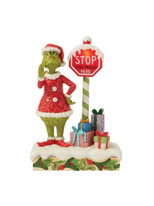 Standing sternly beside a stop sign in his Santa suit, The Grinch frowns and insists that all presents be left with him. With Jim Shore's signature rosemaling and intricate folk art details, the piece captures The Grinch's grumpy holiday spirit.