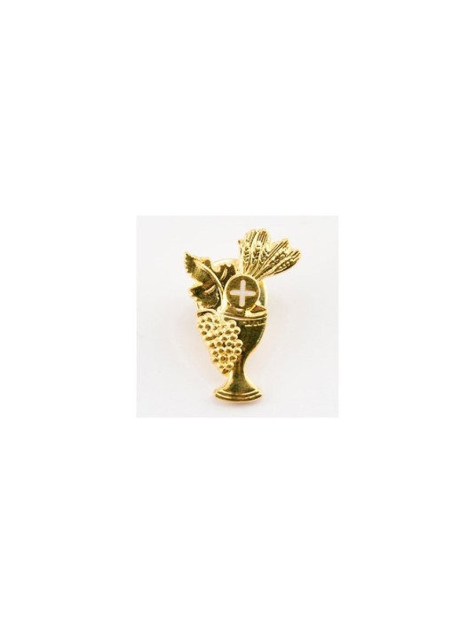 An elegant gold tone chalice lapel pin, symbolizing the Holy Eucharist. Economically priced and carded for easy presentation, it features a secure butterfly clutch backing. Perfect for group gifts, First Communion celebrations, or church events.